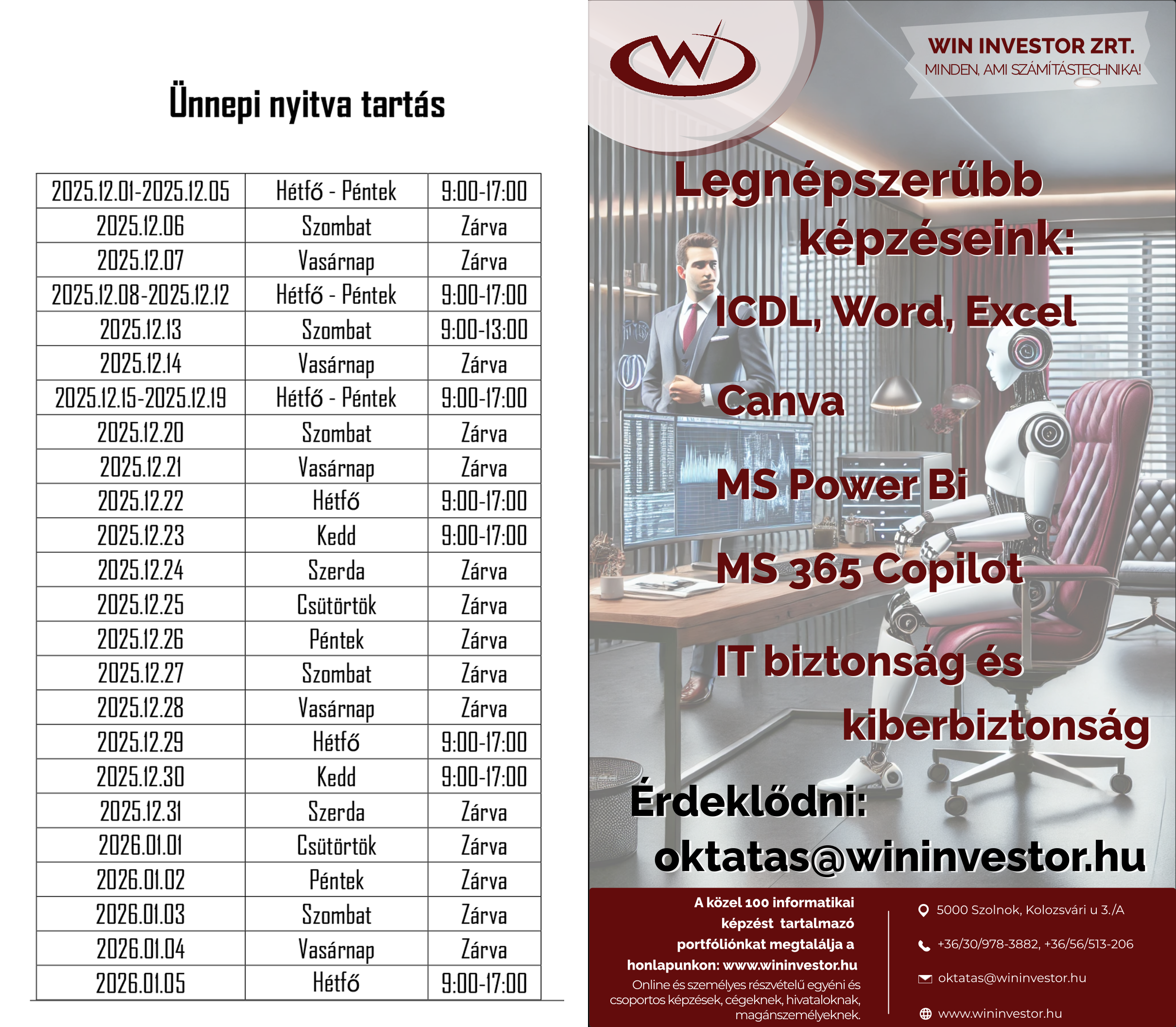 Win Investor Zrt. | 5000 Szolnok, Kolozsvári utca 3/A | Nyitvatartás: H-P 9-17.00 | +36/56/413-086 | info@wininvestor.hu | Nyilv. szám.: B/2020/000489, Eng. szám: E/2021/000132